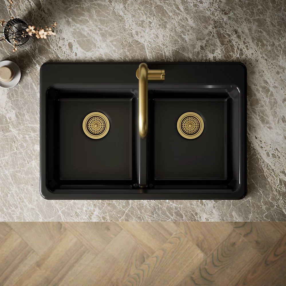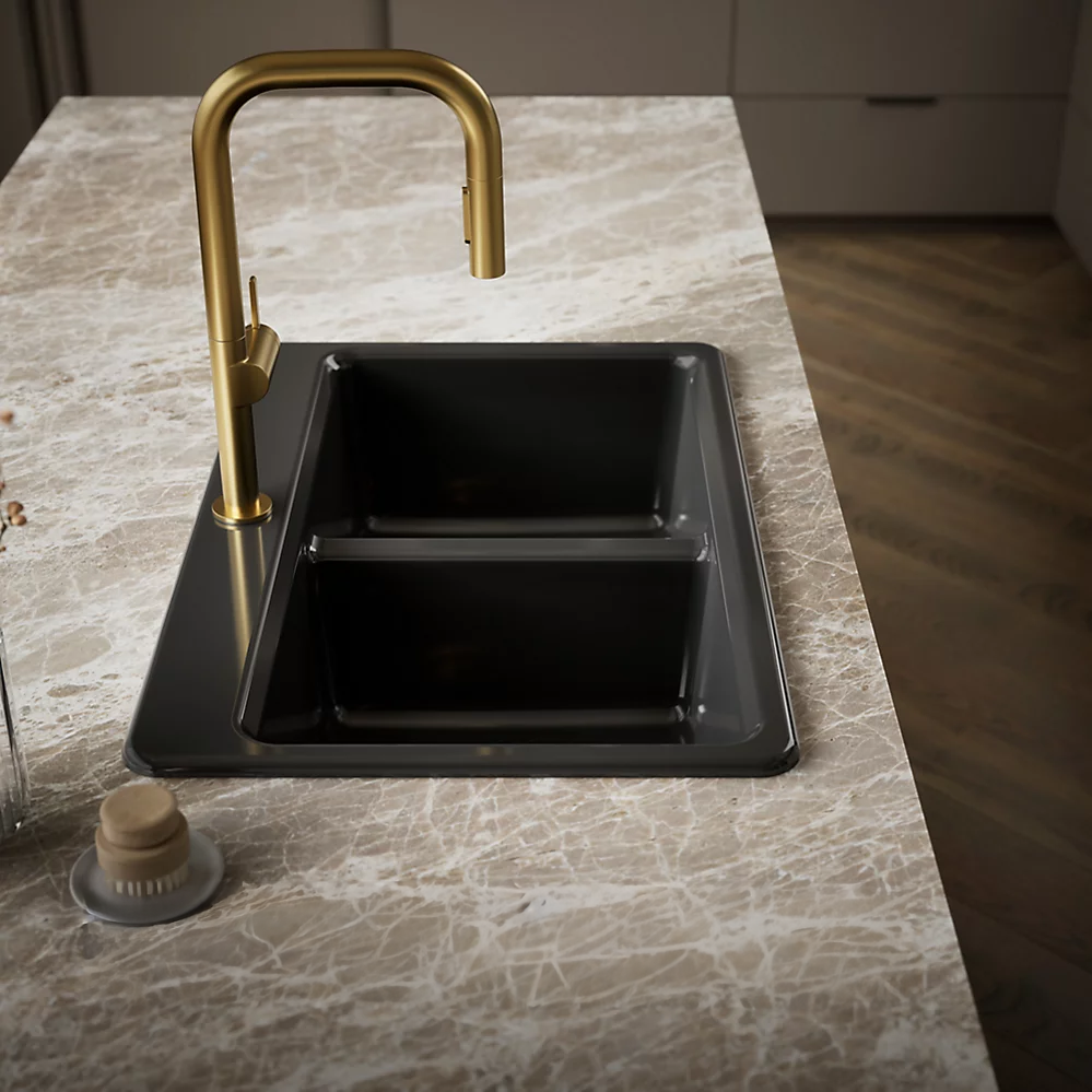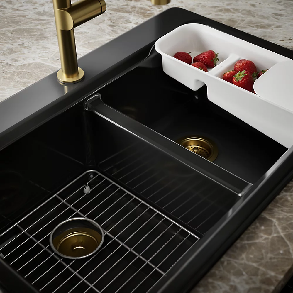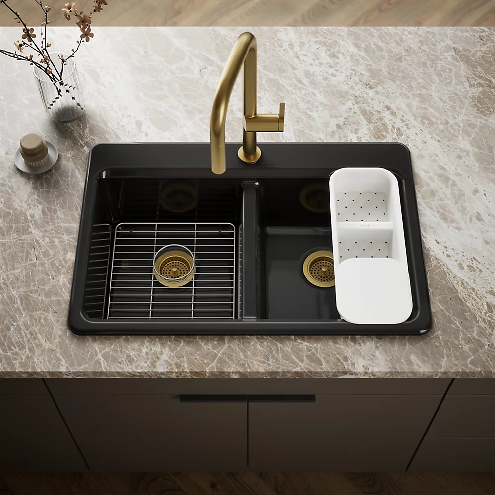 La belleza discreta de este fregadero KOHLER® Riverby lo convierte en una opción elegante y versátil para la cocina. Los dos pozos de igual tamaño cuentan con una base inclinada que minimiza la acumulación de agua. Fabricado en hierro fundido esmaltado, este fregadero de cocina resiste astilladuras, grietas y quemaduras, garantizando años de belleza y rendimiento confiable. Incluye un colador a medida con tabla de cortar integrada y una rejilla inferior de acero inoxidable.