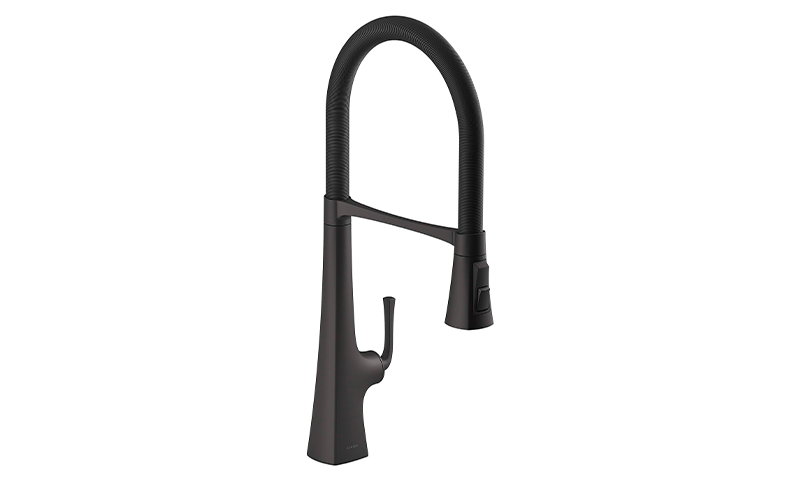 • Grifería semiprofesional para cocina con cubierta de manguera fácil de limpiar con acabado que hace juego.