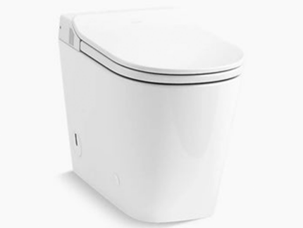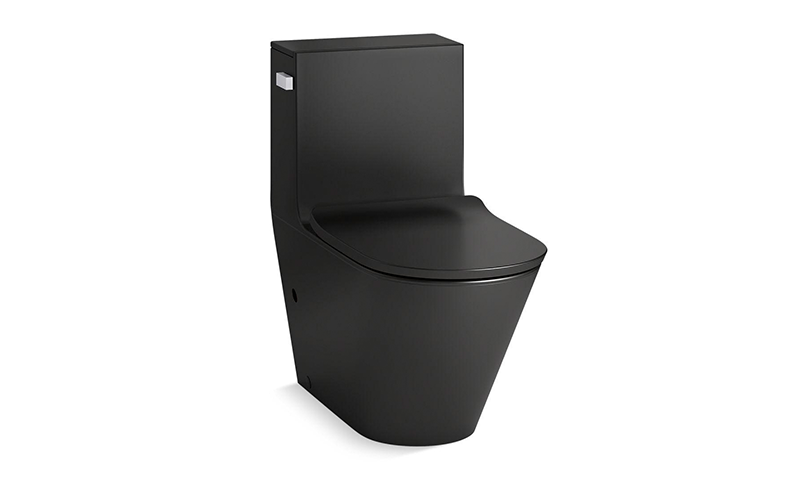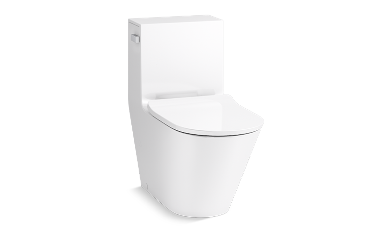 Este inodoro alargado compacto de una pieza no solo ahorra espacio, sino que su capacidad de descarga doble también ahorra agua.